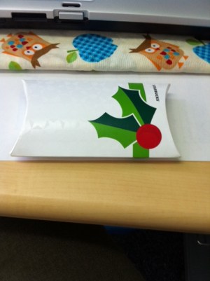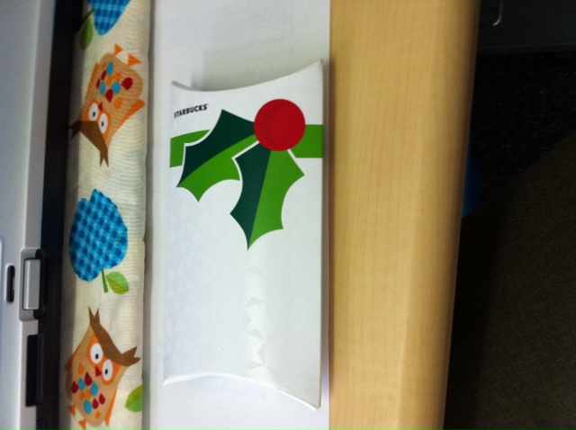 I returned back from a lovely Christmas break last week to find a box in my coffee mug. This small box contained a Starbucks gift card!! Yea!