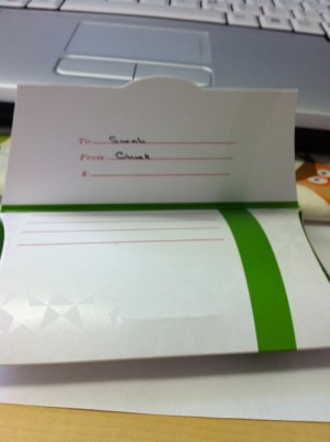 About an hourish later, my sidekick and I were chatting in the lab and I mentioned that I had received said gift, “but it had no name!”, I decried. He said, “yes it did….” I said, “huh? it’s from you?! Thanks!!” He then proceeded to show me the hidden to/from flap.