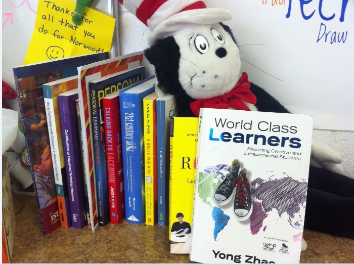 This snapshot is just one of the collections near my desk in the computer lab at school. I read at work every single day. On days when I don’t work with teachers and students, I spend most of my day reading articles, blogs, resource guides, and books about learning. I love that I have a job that includes reading all the time. Every week at my school we have D.E.A.R. (Drop Everything and Read) in lieu of a message at Chapel. It is amazing to experience the entire school reading quietly and enjoying books just for the sake of enjoying them.