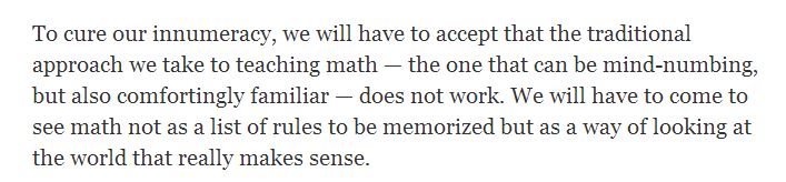 Quick summary. The original article draws comparisons between the intent of American math reforms as seen by a Japanese educator in the 1980’s. Upon his arrival to the US, he found that all of his hopes (and reforms he’d put into place in Japan) were dashed by a didactic American system of learning math. Specifically, an emphasis on answers, products rather than process. There are many causes for lack of implementation within any curricular reform, in the case math, but specifically, the article draws attention to the lack of teacher training when reforms create a dramatic shift. It points to the current shift to the Common Core Math Standards and their emphasis on process and thinking skill over rote computational skill. Lessons that take numeracy out of context and emphasize rote memorization have led to an American population with math-phobia and worse, math innumeracy.